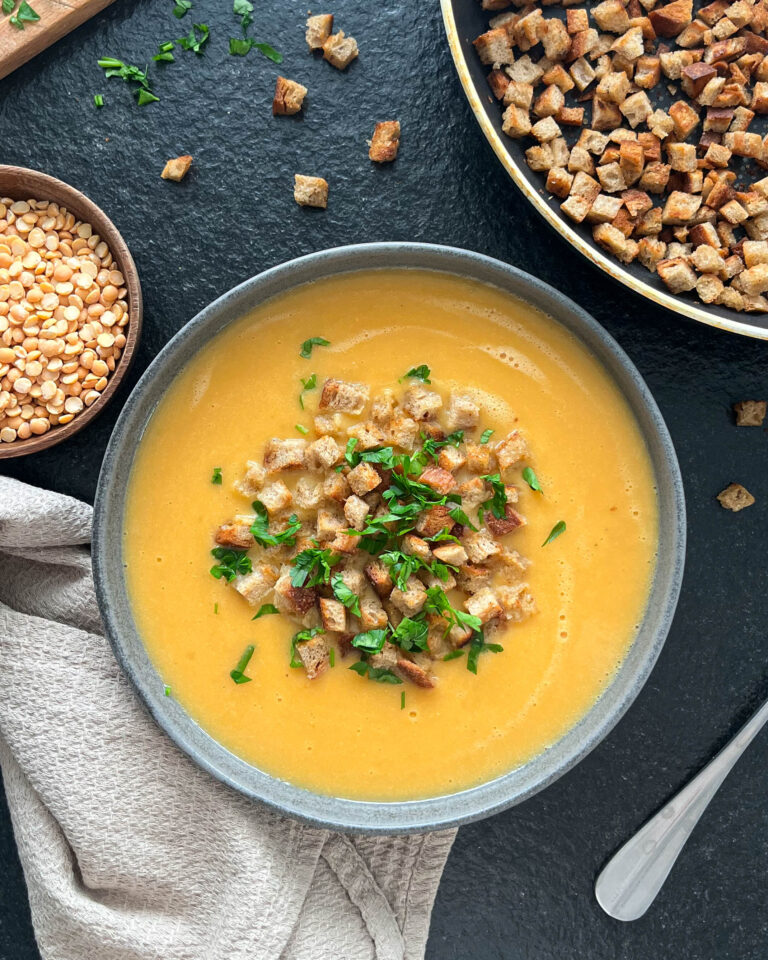 7. Podávame s krutónmi a petržlenovou vňaťou.